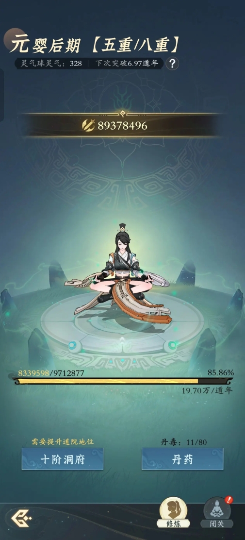 果断加入道院,和传功弟子交谈,开启主线任务(务必狂点跳过剧情,切勿浪费时间)。接着就要挑选修炼派系,具体选法参照要点5。依照主线前往道院分配的洞府,提升洞府等级。持续疯狂点击吐纳按钮,把背包里的丹药全部吃掉,突破至炼气七层,此时丹毒8点。