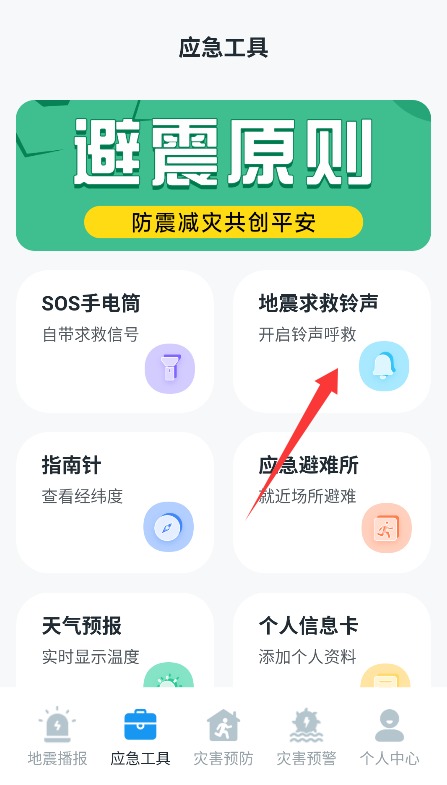 2、在应急工具页面选择"地震求救铃声"功能,进入警报声音设置与管理界面。