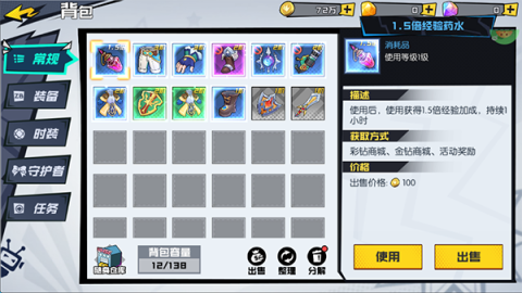 背包系统位于主界面的右侧,让你可以方便查看所有获得的道具。它按类型分为常规、装备、时装、守护者与任务等。每种背包都有独立存储空间,且容量一旦满,你还可以借助随身仓库存放更多物品,每个仓库可储存至多100个道具。