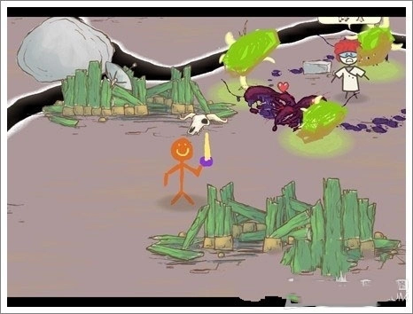 9、接着往前行走,便能瞧见第二只大老鼠怪物。跟之前一样,在画树叶的同时注意躲避,如此便可消灭这只老鼠,随后我们就能救出第二个火柴人。