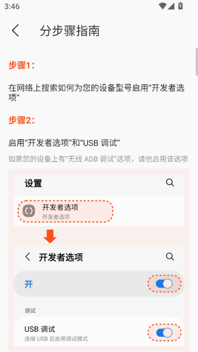 1、启用设备的开发者选项,一般是在设置界面中连续点击版本号五下或七下,也可以自己在网络上搜索自己的设备型号的开发者选项启用方式