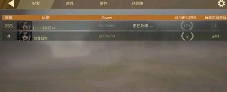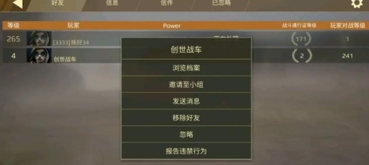 3、如下图所示:好友列表列出了你在游戏中所添加的好友,并且会展示该好友的总声望等级、好友当前使用战车的战斗力,以及好友在本期通行证中所达到的通行证等级等各种信息。