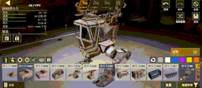 战车装配器的界面主要分为4个部分:左上方绿色部分是战车详情信息,正上方橙色部分是车库蓝图,下方红色部分属于部件选择区,右上方的蓝色部分则是功能区。