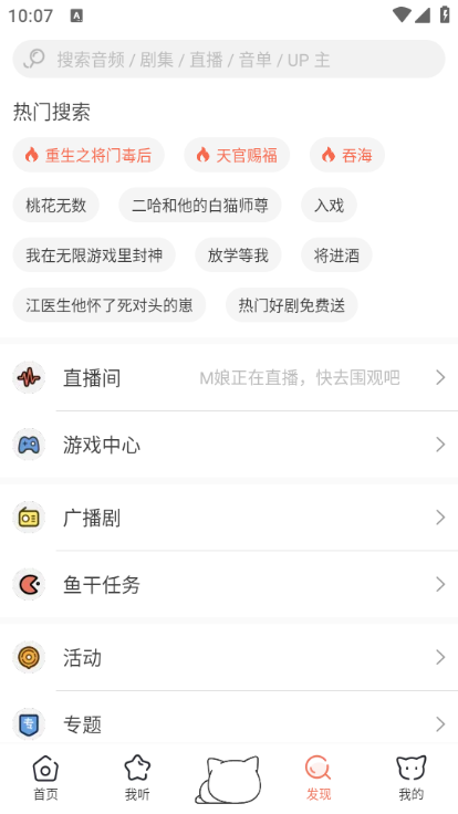 猫耳FM免费版现在与大家分享,汇集了海量高音质广播剧,更有热门声优在线直播互动。所有音频内容均已解锁,无需任何费用即可尽情享受,快来体验吧!