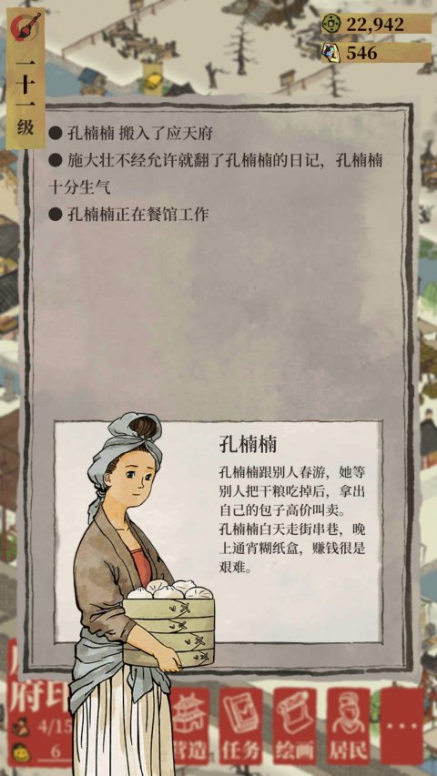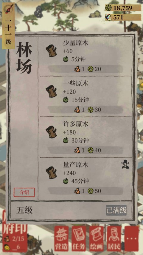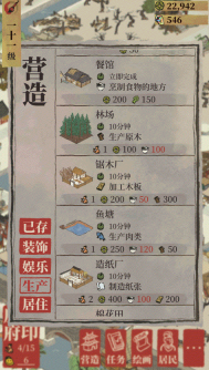 在“居住”类型中,主要包括增加人口的民居、储存物资的仓库以及能够赚取铜钱的商业建筑;而“生产”则有着多种资源建筑,包含农田、林场、餐馆以及造纸厂等,而且相互之间环环相扣,比如农田产出的蔬菜可以在餐馆中制作成食物,林场中的原木,可以在锯木厂中制作成木板,进而在造纸厂中制作成纸张。