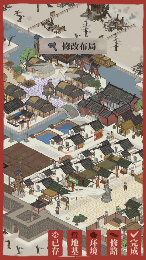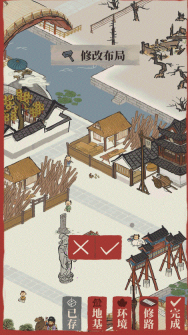 在“娱乐”和“装饰”项目中,所有的建筑和花木都能增加城市的繁荣度,每当繁荣度达到一定条件时,就会解锁一个民居,从而增加居民人口数量,为城镇提供更多的劳动力。