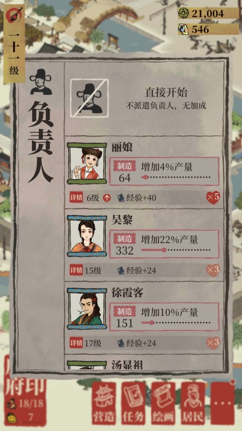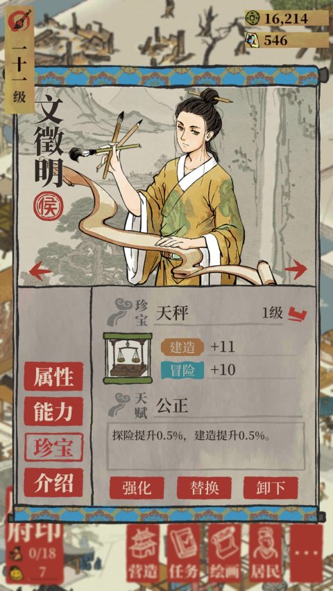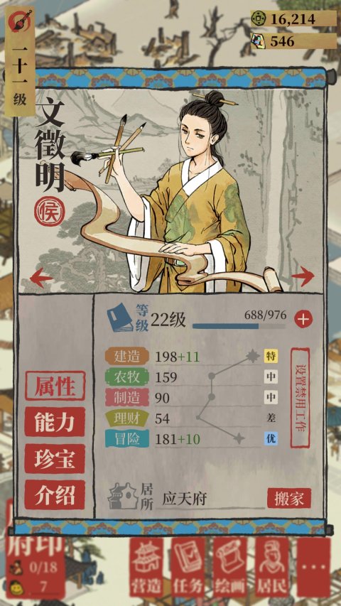 此外,每个角色还都有独有的天赋能力,比如派遣文徽明建造新房子时,能够减少30%的时间消耗;安排董其昌负责制造工作时,额外获得50%的产能。当拥有足够的碎片时,能够让角色进阶,不仅属性值会得到大幅增加,天赋能力也会有所提升。