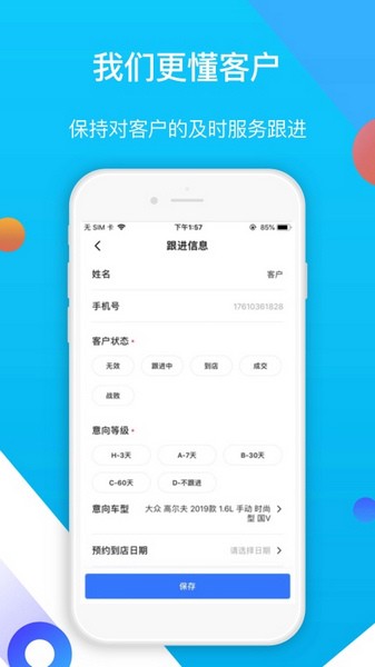 4. 可以在线进行客户管理,电话联系后能够添加跟进记录,选定客户状态、意向等级及意向车型后就可以保存。