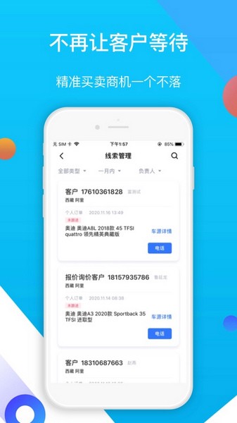 3.进行线索管理,按照类型、时间和负责人筛选推荐的线索,了解客户浏览的车型后可以拨打电话进行沟通;