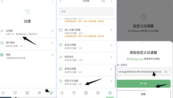设置>>过滤>>过滤器>>自定义过滤器>>添加自定义过滤器>>将URL或者本地文件导入>>导入时不显示txt,点击右上角从文件管理打开,这里再提供以下规则,上面我用的是easychina的。其他规则: