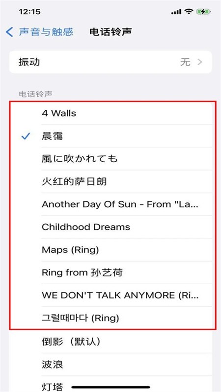 8、在【电话铃声】界面中,在系统铃声分界线上方的都是自定义的铃声,选择即可设置成手机铃声。