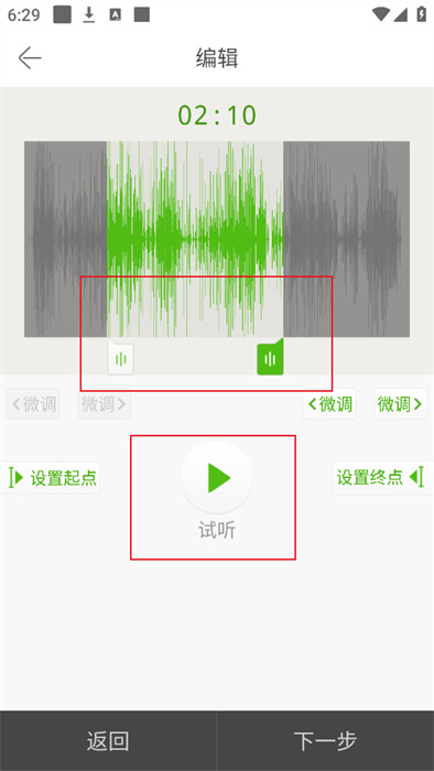 4、接着,你需要调整自己需要的音频片段,并在线试听,如果确定没问题,点击【试听】;