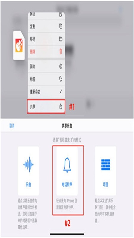 4、在库乐队中找到上一步拷贝的音乐文件,长按文件后在选项框中找到【共享】,点击【电话铃声】。
