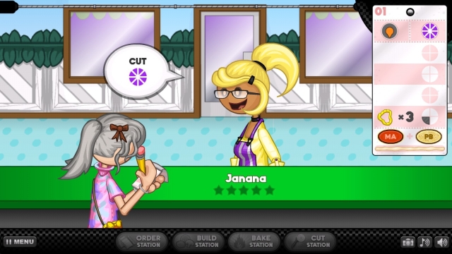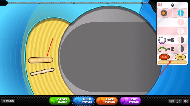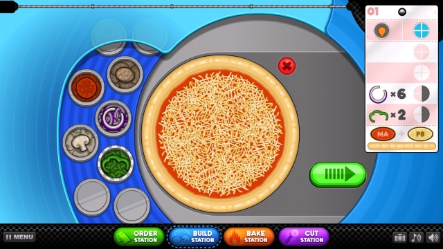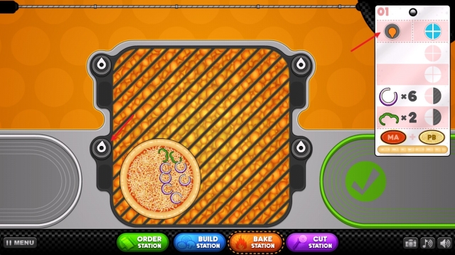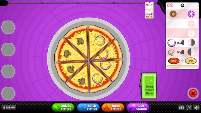 在Papa's Pizzeria,顾客会订购切成四块、六块或八块的披萨。要切片比萨饼,玩家必须在比萨饼上拖动鼠标(或滑动手指)以确定比萨饼切片机在比萨饼上的路径。如果切的片数不正确,或者片大片小,则在将披萨呈现给顾客时将被扣分。