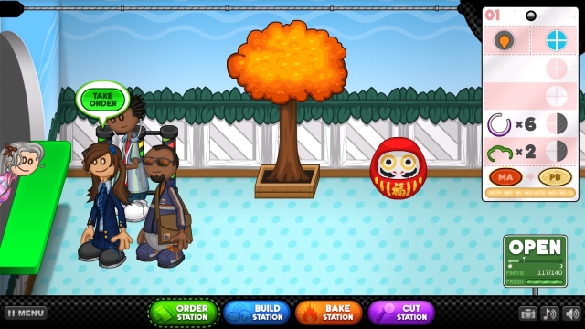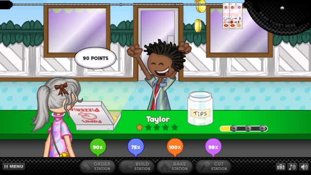 ps:如果顾客在玩家点击“接受订单”按钮之前排队等待的时间太长,或者玩家准备订单的时间太长,那么玩家就会失去积分。顾客会根据玩家制作的披萨打分,并在小费罐中提供小费,以及赚取迷你餐券的积分。