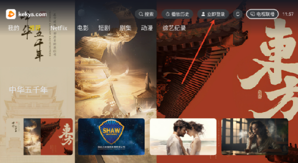 1、开启电视上的可可影视电视版,点击首页右上角的“立即登录”