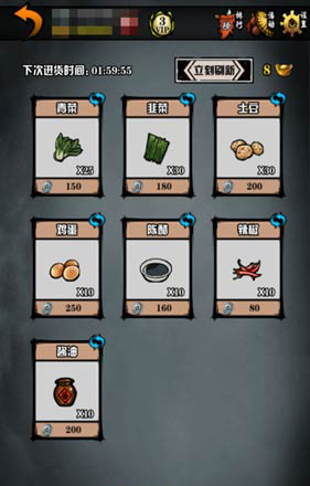 1、华山(13,18)菜贩子处可购买蔬菜,可购买青菜25个(单价150)、韭菜30个(单价180)、土豆30个(单价200)、鸡蛋10个(单价 250)、陈醋10个(单价160)、辣椒10个(单价80)、酱油50个(单价200)。