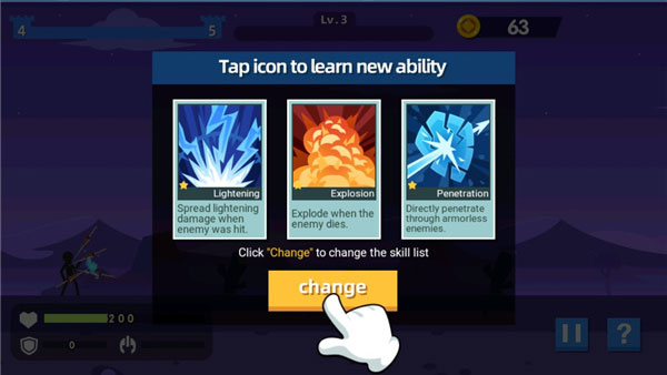 游戏中玩家将作为火柴人,你需要保护好自己不受侵害,抵抗入侵者,对手处于不同的高度,玩家需要根据自己的判断利用手中的弓箭进行攻击。玩家只要成功消灭对手即可解锁新的游戏内容,你必须要用精准的射击手法,有效快速的干掉敌人,过程中你会慢慢掌握游戏里面的技能,完成每次游戏里面的射击任务,取得最后的成功,每次游戏成功都有相应的分数,还有很多金币可得。