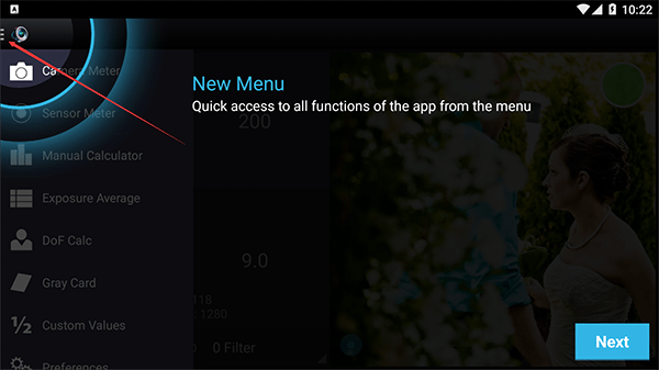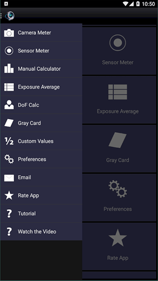 1、启动lightmeter后,点击屏幕左上角的按钮即可展开菜单栏,从而快速访问该应用程序的所有功能;