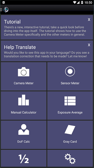 3、老相机辅助测光应用,可以通过摄像头测出当前光线环境下的感光度、光圈、快门组合,显示曝光值,还支持曝光补偿;适合于没有自动曝光的老交卷相机;