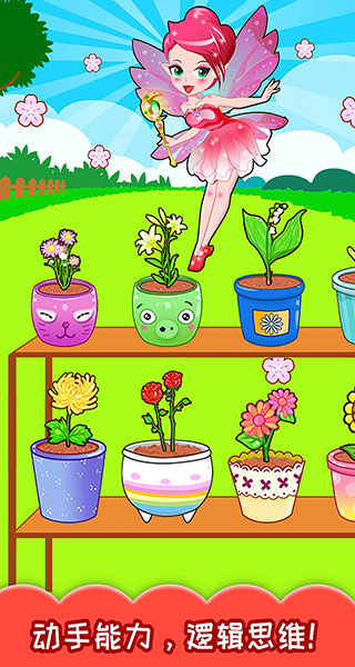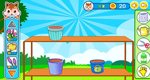 2、宝宝可以从左边选择自己喜欢的花,然后种到盆子里,右边则有化肥、花洒、剪刀等工具。