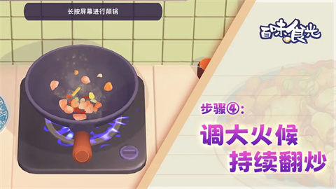之后就可以开始放入食材了,拿起刚才切好的食材放入锅中,点击屏幕拿起炒锅,长按屏幕颠锅将锅里菜进行加热。