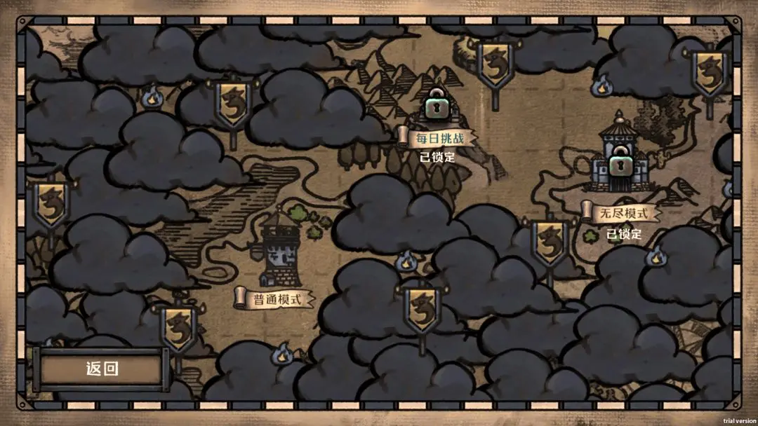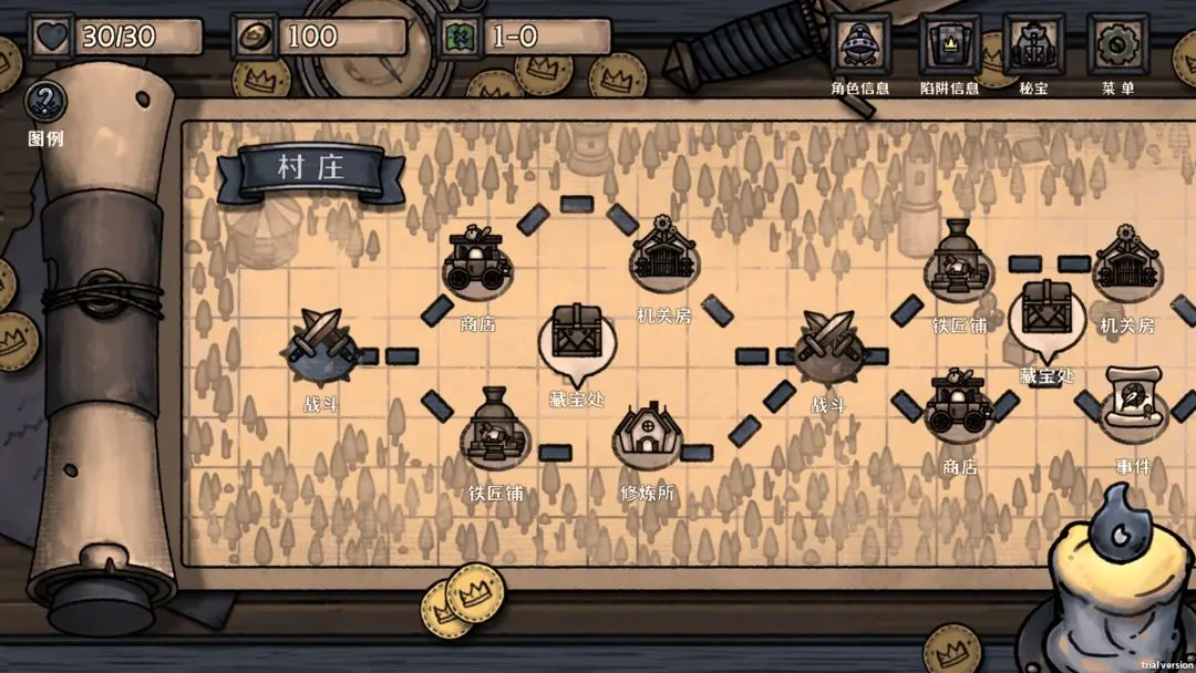 进入了关卡界面,关卡内一共有三个章节,通过选择事件推动章节进程,每个章节最后会面临挑战,战胜Boss即可选择“神器”奖励(神器可以大幅增加建造陷阱所需的初始木材资源,并获得强力的全局被动效果),通关三个章节的全部Boss视为胜利,未能守住血量则视为“失败”,但失败也可以获得局外养成的游戏币和经验等资源。
