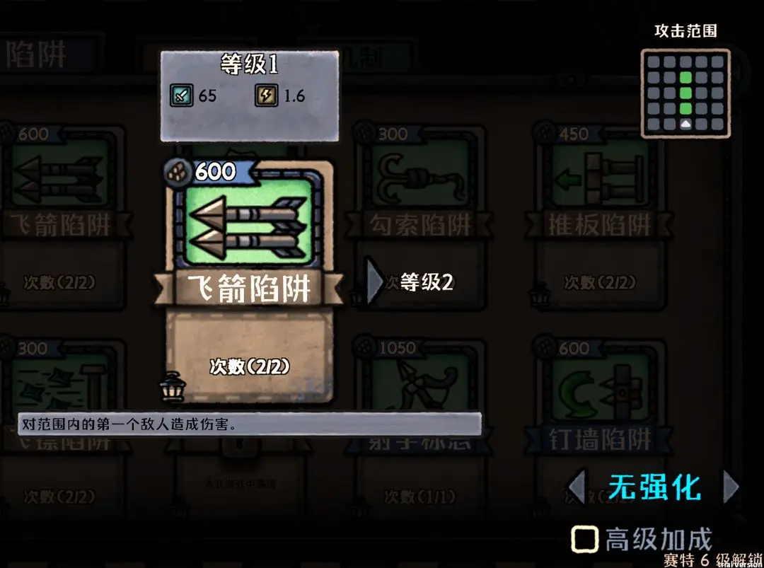 3、等级:等级越高,陷阱等级上限越高(需要在对局内点击陷阱消耗木材强化),可能的强化项包括:攻击力提升、攻击频率提升、消耗木材降低等等,受限于强化等级。