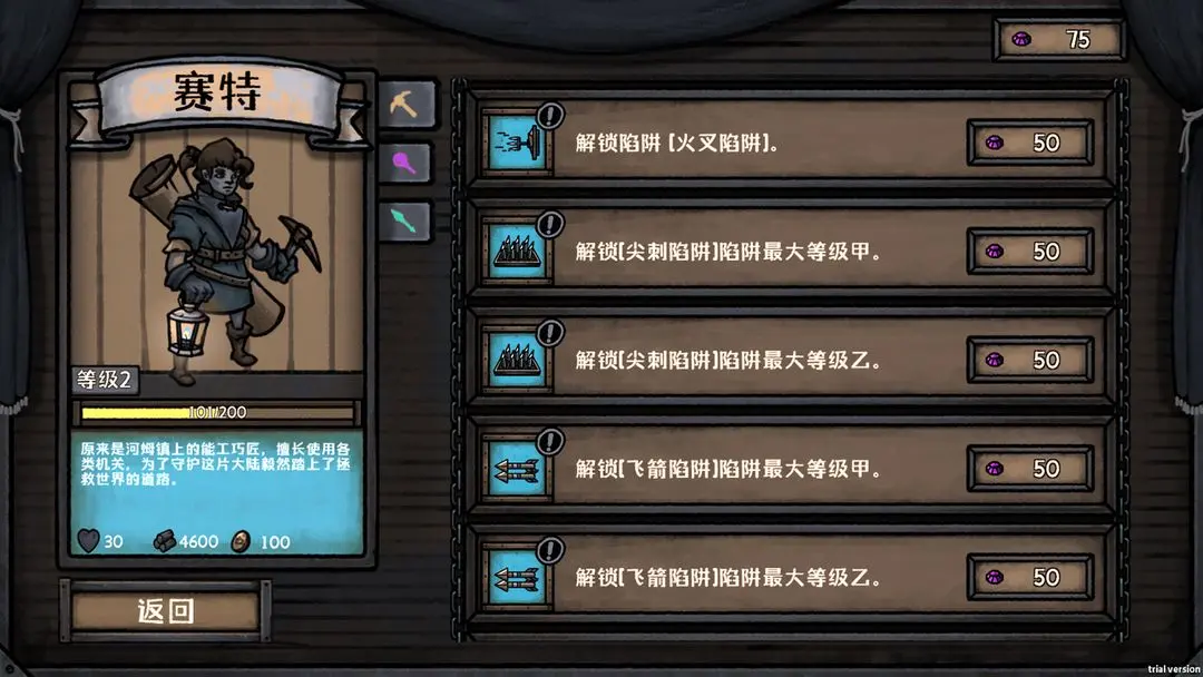 2、角色:养成界面,可以消耗游戏币解锁并升级陷阱/秘宝。