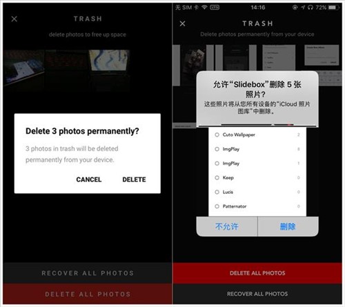 4、需要提到的一点是在 Slidebox 中被拉到垃圾箱的图片并不是直接被删除的,你点击垃圾箱在回收站中查看或恢复这些图片,当然,也可以删除它们。