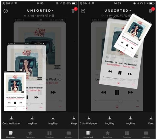 3、最初的设置完成之后,便可以开始整理相册了,整理相册的操作只有几种:上划删除,点击下方相册将当前图片归类到下方,左上角撤销操作(iOS 端还有收藏以及长按分享功能,但对于仅将 Slidebox 用于图片整理的我来说没有什么用处,有需要的可以进行使用)。接下来,简单的滑动与点按便可以将所有的图片进行分类,分类完后打开系统相册,所有的图片也就已经按照你的分类归类完成了。