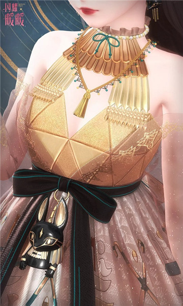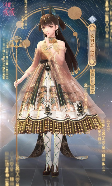发梢金色的珠缀,用尺寸精巧的安努瓦造像打造成的耳饰,裙摆与鞋面的暗金花纹……仿佛能令人回忆起月夜山林间神秘的嚎声。