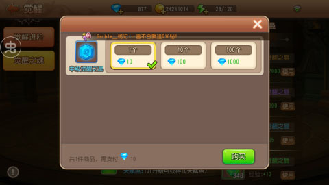 觉醒系统主界面右上角的地方有一个觉醒之晶的带下划线标识,就是上图中红色圈圈的位置,戳进去看看吧!