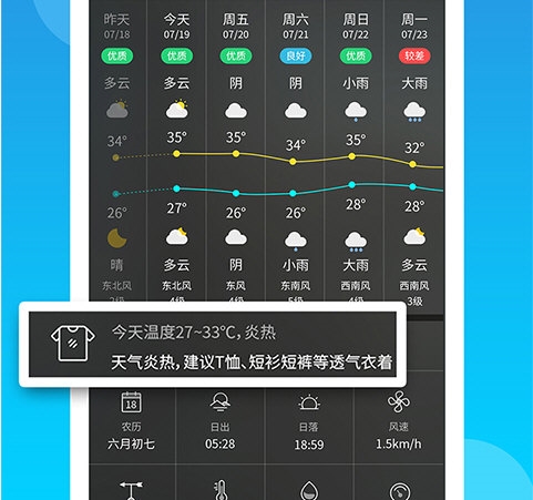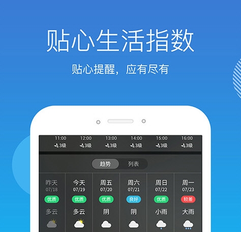 天气生活指数:晴天雨天各项指数综合看,根据天气轻松安排户内外活动。
