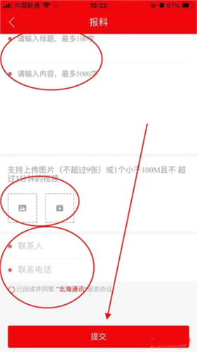 进入报料界面后,填写您的报料标题、内容、联系人、联系电话、上传图片,最后勾选已阅读同意,然后点击【提交】即可。