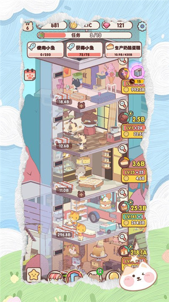 动物欢乐作坊是一款模拟经营类游戏,游戏中满是可爱的猫咪。玩家要通过点击甜品台挑选配方制作甜品,接着把做好的甜品放置到展示柜,最后由配送车辆负责外送,以此获得金币与经验值。之后,玩家点击任务栏就能知晓新任务,进而获取新业务与新建筑。当首座城市获得五星评价,便可以开启分店系统,玩家能够派遣经理猫咪前往新地区,实现同步管理。游戏里还有众多不同种类的猫咪,每只猫咪都具备独特的属性加成,合理分配这些加成,能让游戏过程更为轻松。