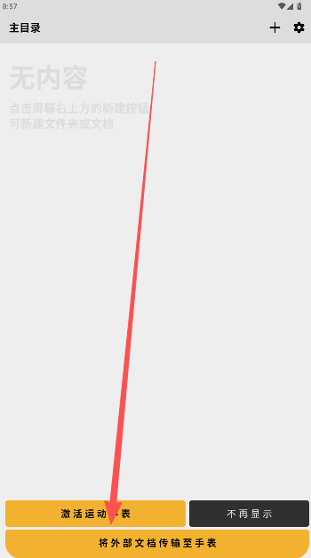 请点击主页下方“将外部文档传输至手表”的按钮,然后在设备存储中挑选想要传输的文档。