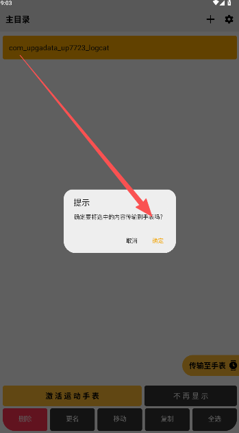 1、长按主目录已导入内容,在下方弹出提示框内选择传输至手表。
