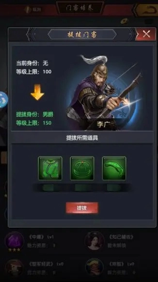 大人可以消耗银两提升门客的等级,门客的等级提升后会根据当前门客的资质增加属性值;