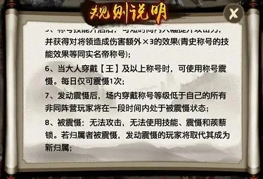 在副本“全军出击”里,称号所发挥的作用更为强大!若大人拥有王以上级别的称号,不仅能额外施展技能,在短时间内极大提升攻击力,还可使用称号进行一次震慑。发动震慑后,场内所有称号低于自身且非同阵营的玩家,都会陷入无法攻击的震慑状态。若处于震慑状态的玩家有归属,那么发动震慑的玩家将取而代之,成为新的归属者。