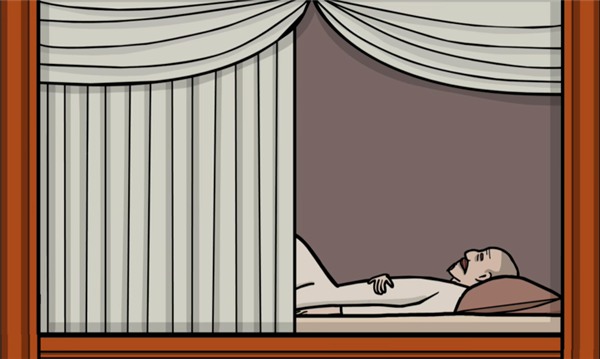25. 镜头拉远,滑开他床边的帘子。他正在睡觉,暂时别打扰他。