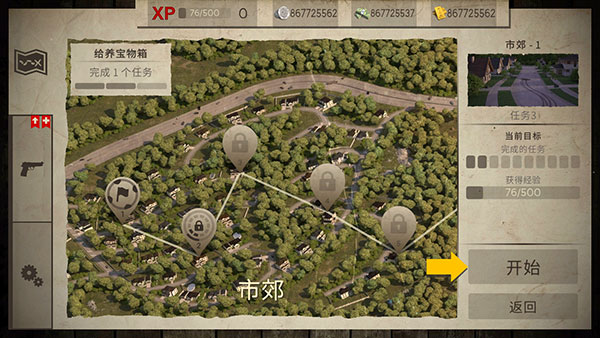 1、在市郊中能够进行探索,以闯关的形式来完成任务,获得经验,每关的丧尸数量都有所不同。