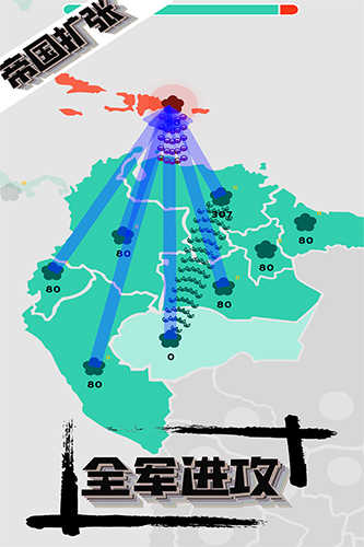 3、点击拖动地图块中间的圆点,即可表示派遣单位进行攻击扩张,圆点旁边的数字表示单位数量,单位数量会随着时间自动增长,数量越多,地图块的颜色也就越深。