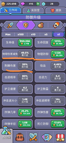 既然是主打击退护卫流,其原理在于凭借高击退效果,将敌人击退至【护卫】范围之外,然后借助【护卫】以及卡片【死亡射线】(紫)来造成伤害。至于卡片的具体选择,可参照第五条。工作坊里价格实惠的道具,都可以逐步拉满等级。在游戏局内,肉盾角色只需提升【死亡防御】和【生命】属性,其他的属性暂时无需关注。