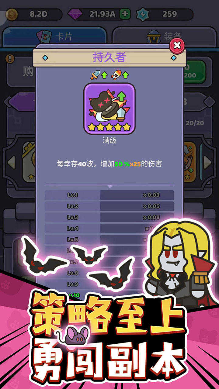 - 收集并升级各种有利于增强战斗能力的卡牌。