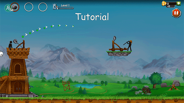 5、操作简单直观。点击屏幕并拖动,即可让弹射器蓄力并调整拉力。随后松开手指,向敌方火柴人发射炮弹,将其一举摧毁!