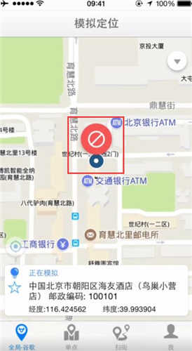 7、并不是用户目前的真实位置,这就是所谓的模拟定位,点击红色的图标禁用图标即可退出模拟定位;