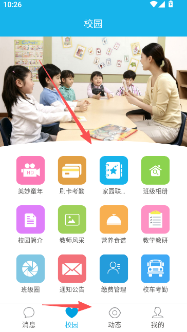 3、登录成功以后,在校园版块可查看关于教学活动开展的全部内容部分,比如刷卡考勤、教师风采以及班级圈等常见教辅功能。