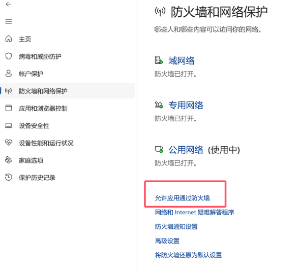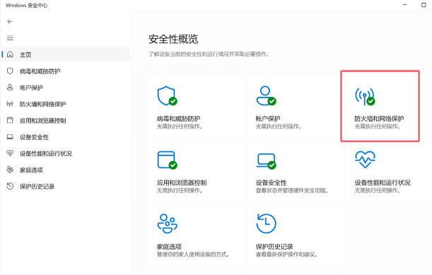 1.打开 Windows 安全中心,点击“防火墙和网络保护”