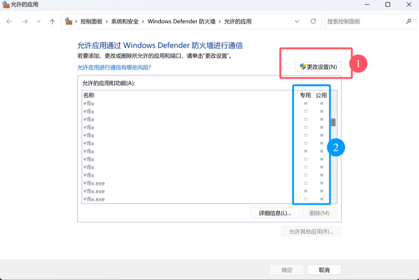3.在弹出的窗口中,先点击“更改设置”,再在列表中找到 Flix,在右边勾选“专用”和“公用”,操作完后点击保存